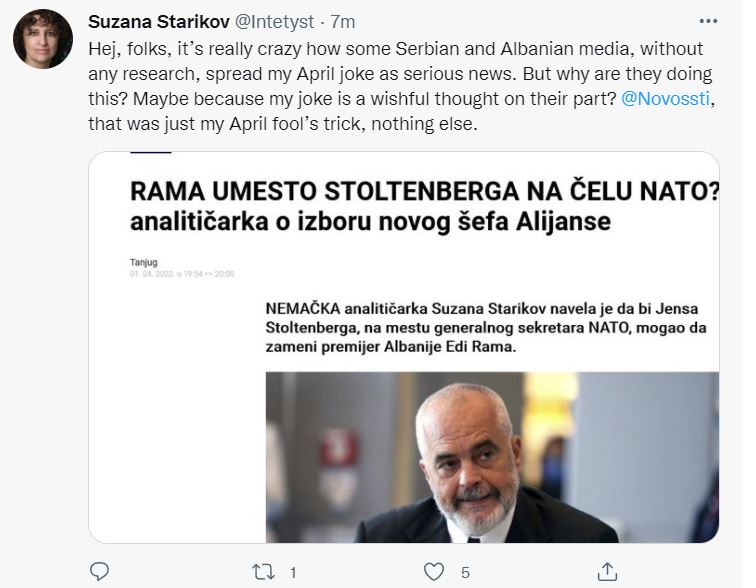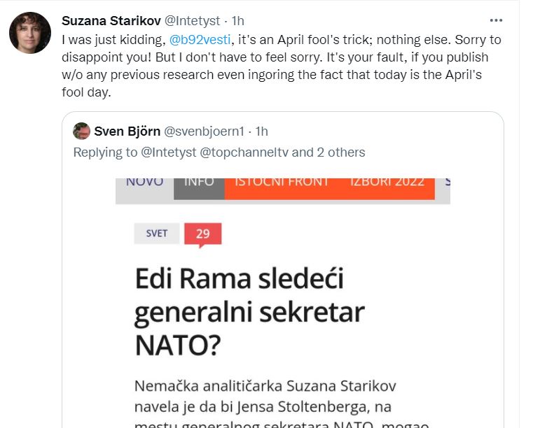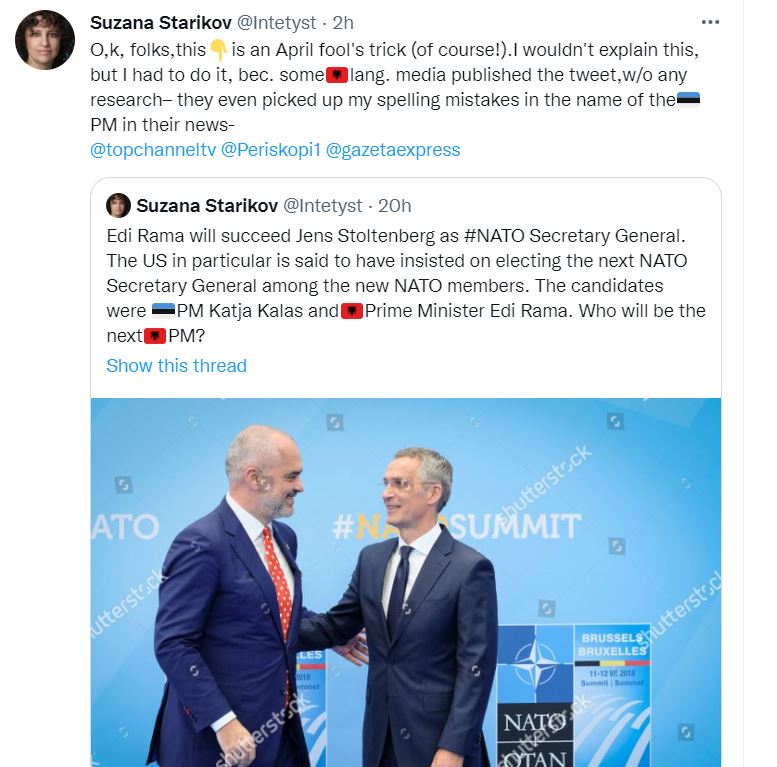 “Ok, njerëz, ky është një truk për 1 prillin (sigurisht!). Nuk do ta shpjegoja këtë, por duhej ta bëja, sepse disa media në Shqipëri e publikuan postimin në Tëitter pa ndonjë hulumtim – ata madje morën gabimet e mia drejtshkrimore në emër të kryeministres së Estonisë në lajmet e tyre.” – shkruan Starikov.