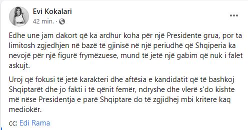 Në një postim në rrjetet sociale, Kokalari duke cituar kryeministrin Edi Rama se është dakord që ka ardhur koha për një Presidente grua, por thekson se ta limitosh zgjedhjen vetëm në bazë të gjinisë mund të jetë një gabim i pafalshëm.