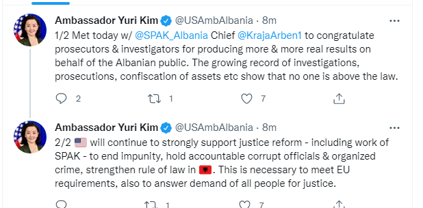 SHBA do të vazhdojë të mbështesë fuqimisht reformën në drejtësi – përfshirë punën e SPAK – për t’i dhënë fund pandëshkueshmërisë, për të mbajtur përgjegjës zyrtarët e korruptuar dhe krimin e organizuar, për të forcuar sundimin e ligjit në 🇦🇱. Kjo është e nevojshme për të përmbushur kërkesat e BE-së, gjithashtu për t’iu përgjigjur kërkesave të të gjithë njerëzve për drejtësi.”- shkruan ajo.