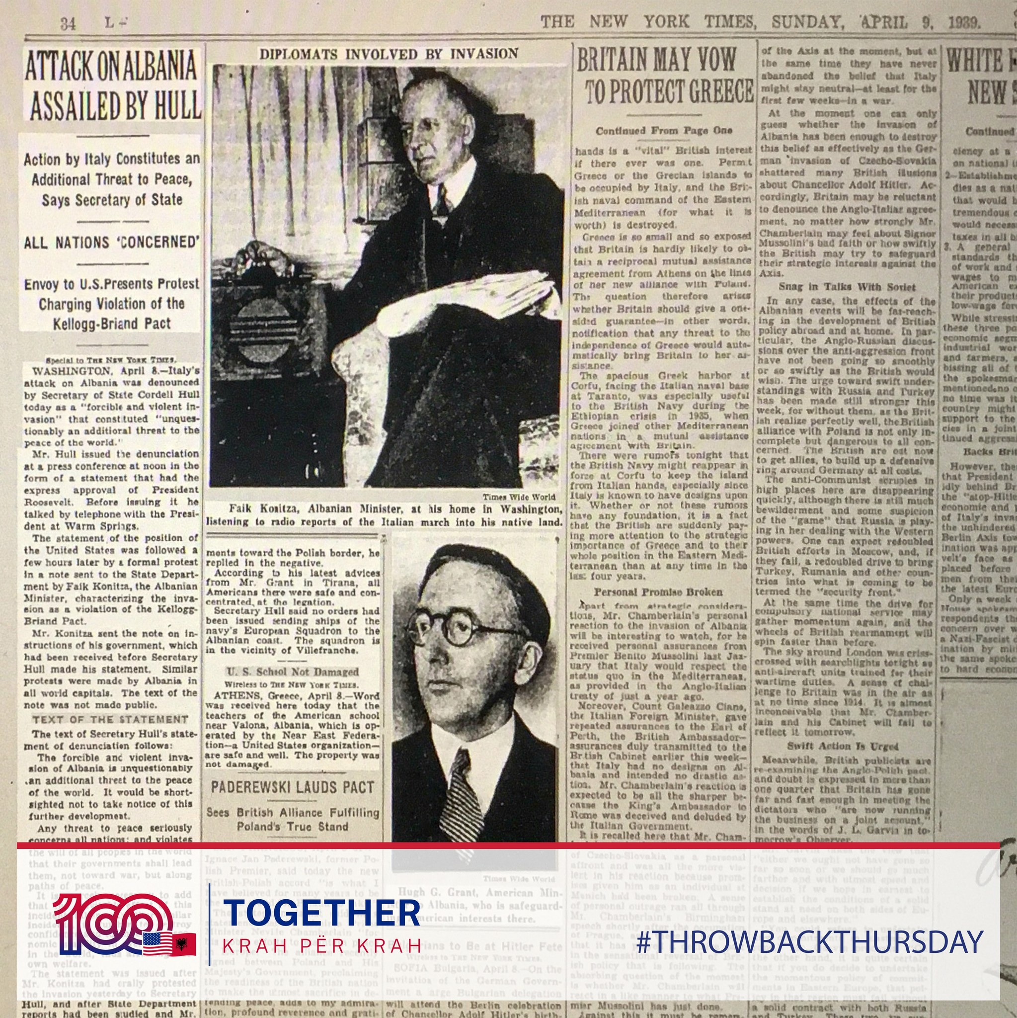 Sipas artikullit të Times, deklarata u pasua pak orë më vonë nga një protestë zyrtare për pushtimin, dërguar Departamentit të Shtetit nga Faik Konica, në atë kohë Ambasador i Shqipërisë në Shtetet e Bashkuara. Artikulli përfshin gjithashtu një foto të Konicës duke dëgjuar lajmet radiofonike të pushtimit italian në vendlindjen e tij.”– thuhet në postimin e ambasadës.