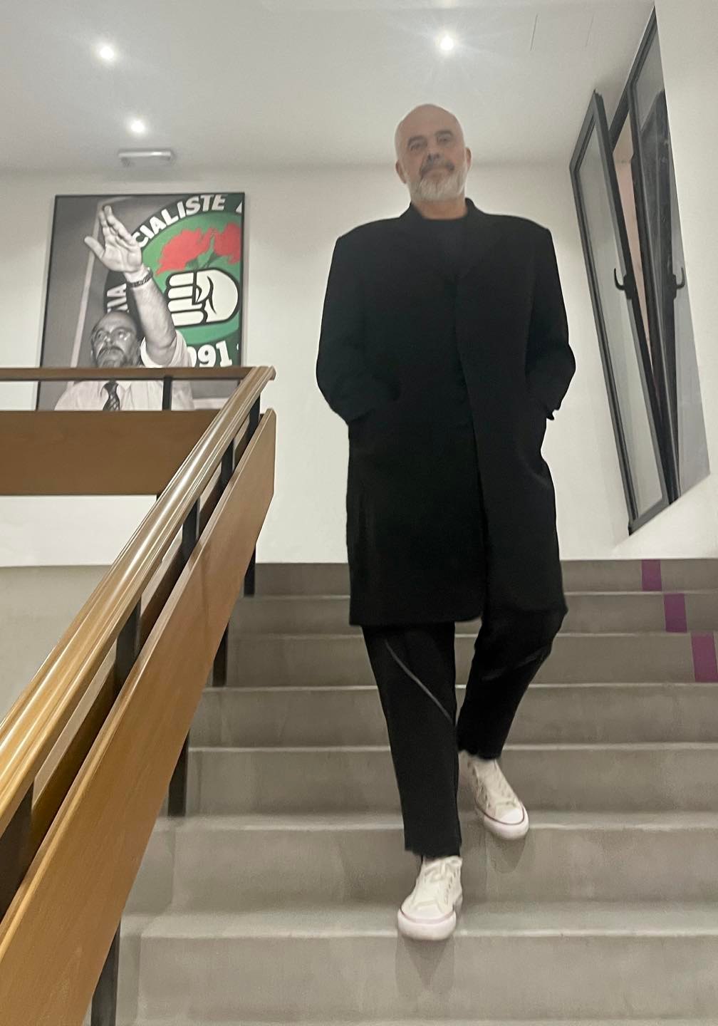 Ai shfaqet duke zbritur shkallët, ndërkohë që prapa në sfond ka një fotografi të ish-kryeministrit dhe ish-kryetarit të PS-së, Fatos Nano.