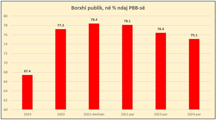 Sipas tabelave të Bankës Botërore, borxhi publik pritet të zbresë në 75.1% të PBB-së në vitin 2024.