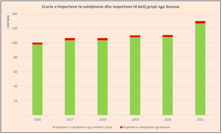 Në vitin 2021 Shqipëria importoi 130 miliardë lekë ushqime dhe pije ne total, ndërsa importet nga këtij grupi nga Kosova ishin 3 miliardë lekë ose 2.4 për qind.