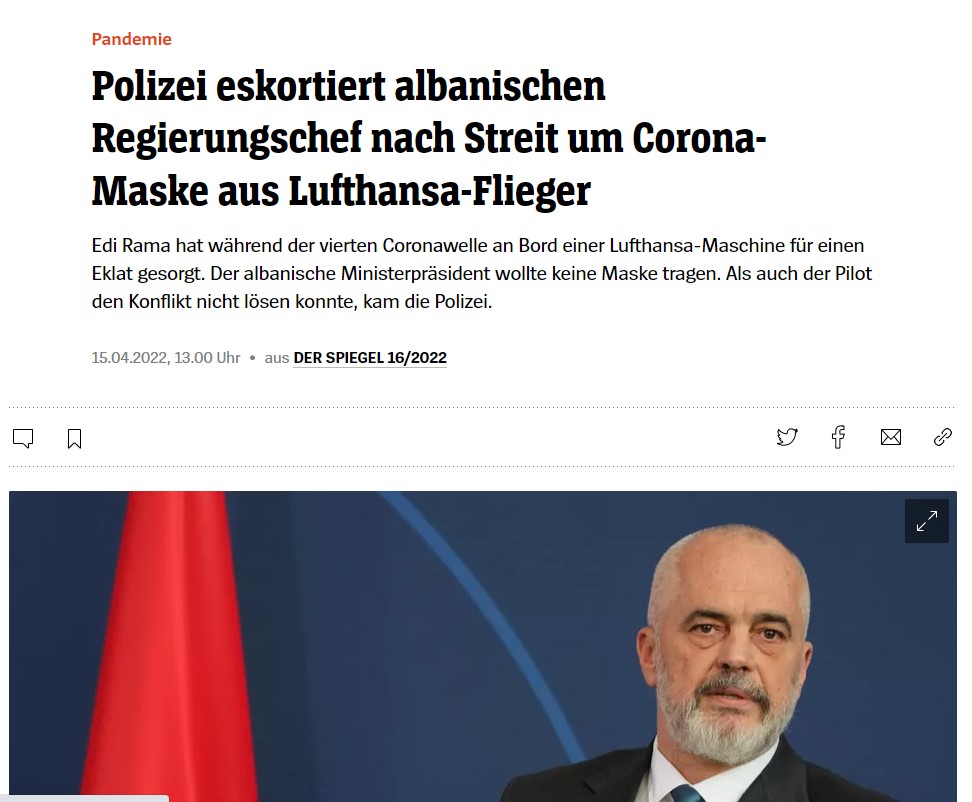 “Kryeministri shqiptar Edi Rama shkaktoi një skandal në bordin e avionit të Lufthansa gjatë valës së katërt të koronavirusit.”– e nis artikullin e saj gazeta gjermane “Spiegel.de”.