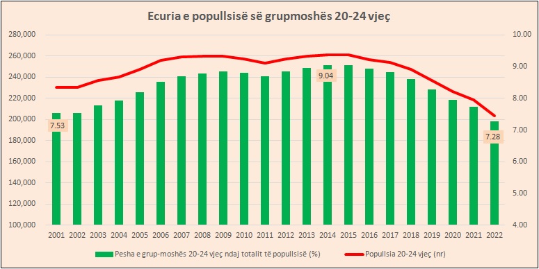 Por, zhvillimi më shqetësues është fakti që në pjesën më të madhe të kësaj tkurrjeje ka ndikuar rënia e numrit të grup-moshës 20-24 vjeç, që është dhe pjesa më vitale dhe në moshë produktive e popullsisë. Kjo grup-moshë shënoi një rënie me 15 mijë persona, duke ndikuar në gati gjysmën e tkurrjes së popullsisë totale të vendit.