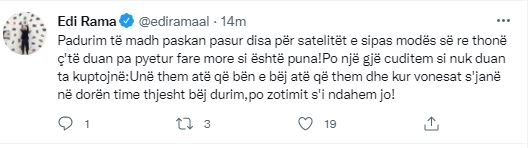 “Padurim të madh paskan pasur disa për satelitët e sipas modës së re thonë ç’të duan pa pyetur fare more si është puna! Po një gjë çuditem si nuk duan ta kuptojnë: Unë them atë që bën e bëj atë që them dhe kur vonesat s’janë në dorën time thjesht bëj durim,po zotimit s’i ndahem jo!”-shkruan Rama.