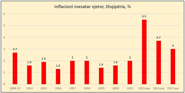 Këto janë nivelet më të larta që nga viti 2004, kur FMN raporton të dhënat. Për periudhën 2004-2013, inflacioni mesatar është luhatur në 2.7%, ndërsa nga viti 2014 deri në 2021 është luhatur midis 1.3-2%.