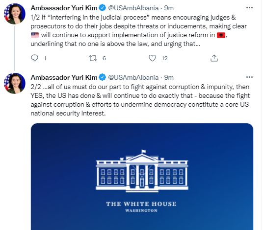 “Nëse ‘ndërhyrja në procesin gjyqësor’ nënkupton inkurajimin e gjyqtarëve dhe prokurorëve që të bëjnë punën e tyre pavarësisht kërcënimeve apo nxitjeve, duke e bërë të qartë që SHBA do të vazhdojë të mbështesë zbatimin e Reformës në Drejtësi në Shqipëri, duke nënvizuar se askush nuk është mbi ligjin, dhe duke kërkuar që të gjithë ne duhet të bëjmë pjesën tonë për të luftuar kundër korrupsionit dhe mosndëshkimit, atëherë PO, SHBA ka bërë dhe do të vazhdojë ta bëjë pikërisht këtë – sepse lufta kundër korrupsionit dhe përpjekjet për të minuar demokracinë përbëjnë një interes thelbësor të sigurisë kombëtare të SHBA-së.”– shkruan Kim.
