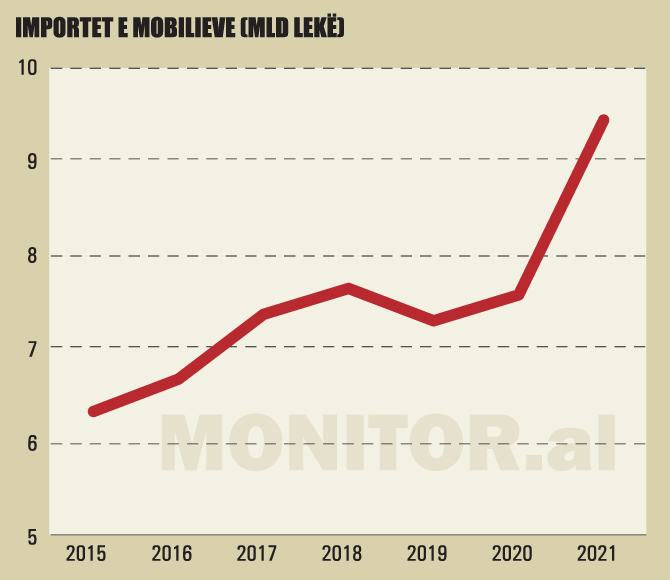 Importi i mobilieve në vitin 2021 u rrit 28,3% krahasuar me 2019-n. Sipas të dhënave të doganave, importet ishin 24% më shumë në raport me 2020. Peshën kryesore e zënë importet nga Italia (26%), e ndjekur nga Turqia (20%), Kina, Greqia dhe shtete të tjera.