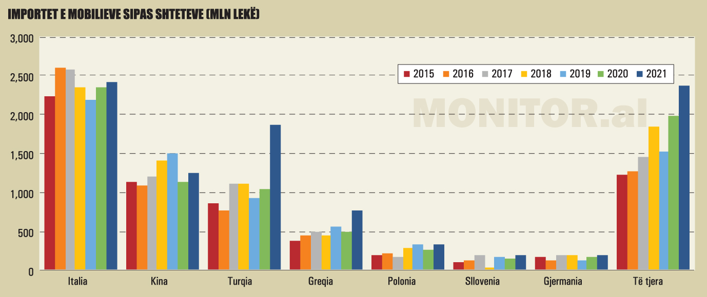 Mobiliet e gatshme të importuara në vitin 2021 ishin 49% më shumë se në vitin 2020, sipas të dhënave të doganave. Importet e mobilieve nga ky shtet kanë shënuar trend rritës nga viti në vit.