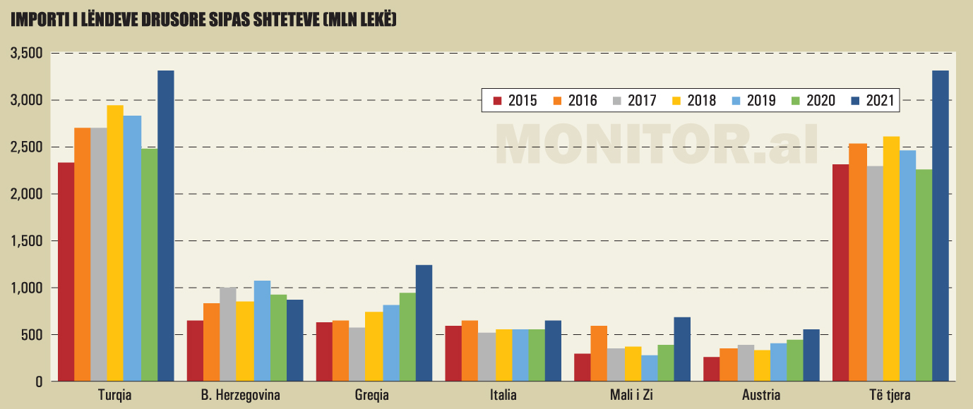 Peshën kryesore tek importet e lëndës drusore për vitin 2021 e zë Turqia (32%), e ndjekur nga Greqia, Bosnjë-Hercegovina dhe Mali i Zi. Për periudhën 2015-2021, sipas të dhënave të doganave, janë importuar 19,2 mld lekë lëndë drusore.