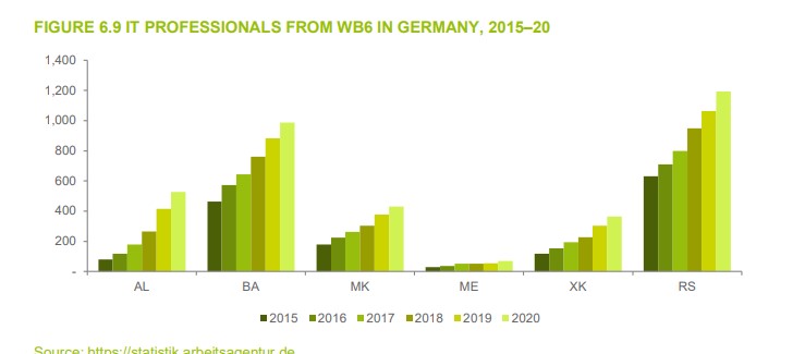 Vetëm në vitin 2020 ikën nga Shqipëria 500 punonjës të TIK, numri i tyre ishte 6 herë më i lartë se në vitin 2015. Për Maqedoninë e Veriut numri i profesionistëve të rinj të TIK të punësuar në Gjermani korrespondon me 8% të të diplomuarve në TIK mesatarisht në vit. Të dhënat për Bosnjë dhe Hercegovinën në 2018 sugjerojnë që numri i të diplomuarve në TIK është mbi 800, teksa 13% e tyre u zhvendosen në Gjermani ndërmjet 2019 dhe 2020.