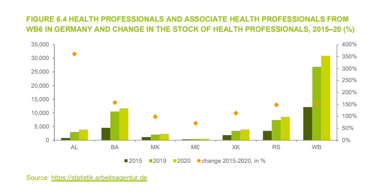 Përgjatë 2015 -2020 stoku i punonjësve shëndetësorë nga Ballkani në Gjermani është rritur në mënyrë të konsiderueshme bazuar në të dhënat e ofruara nga Agjencia Federale Gjermane e Punës. Punonjësit e shëndetësisë përfaqësohen nga mjekë, infermierë, por edhe profesionistë të tjerë të specializuar shëndetësor si dentistë, farmacistë, ose fizioterapistë.