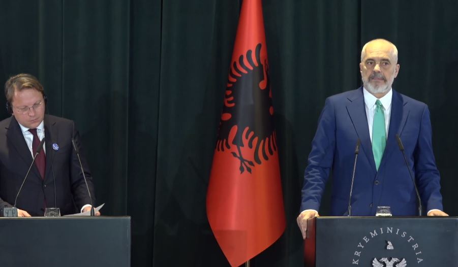 Kryeministri Edi Rama po mban një konferencë të përbashkët për shtyp me Komisionerin e Bashkimit Europian për Zgjerimin dhe Fqinjësinë e Mirë, Oliver Varhelyi, pas përfundimit të takimit me këtë të fundit.