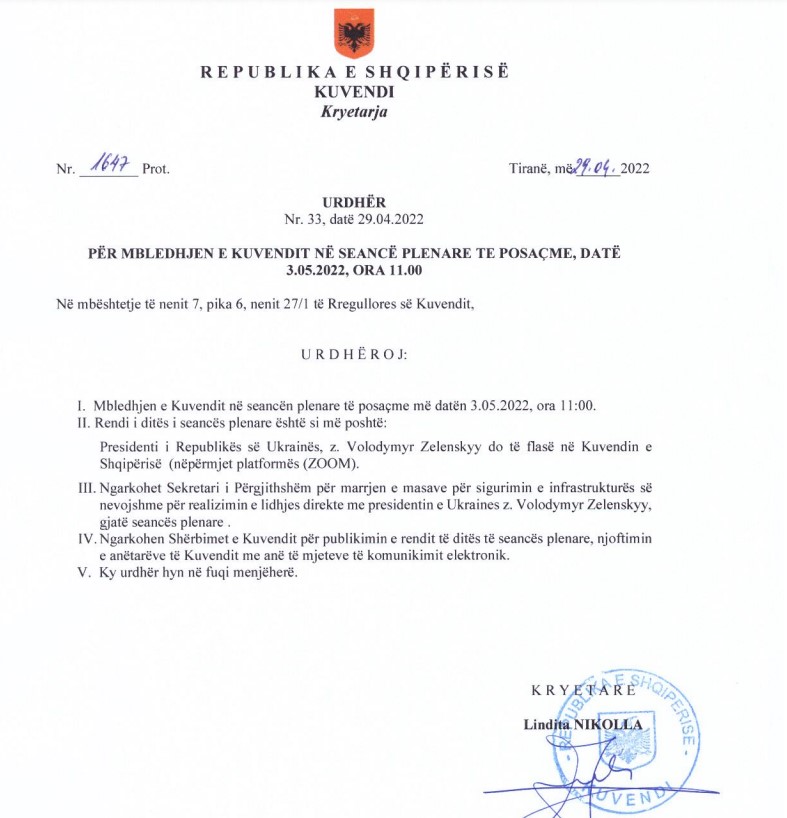 Në seancën plenare të 3 Majit, presidenti ukrainas Volodymyr Zelensky do t’i drejtohet Kuvendit të Shqipërisë përmes një lidhjeje me video.