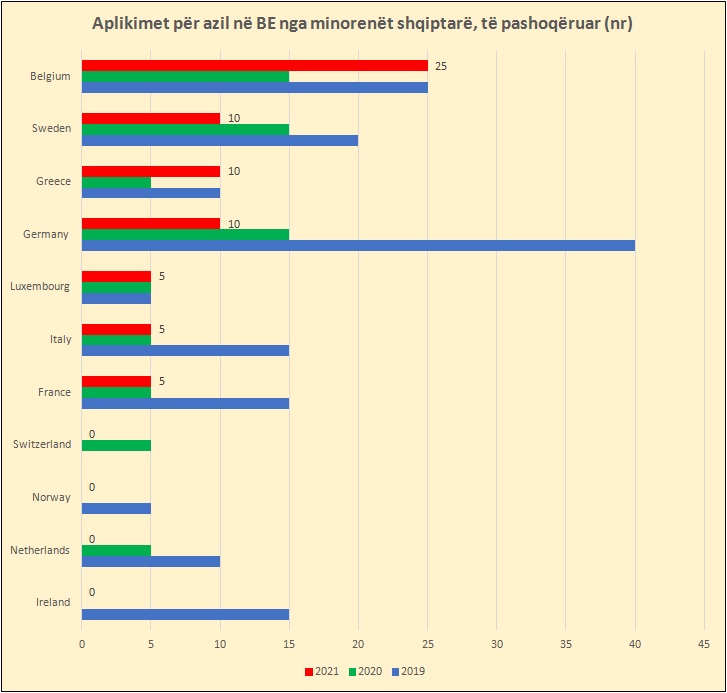 Të dhënat e Eurostat bëjnë të ditur se në vitin 2021 u shënuan 70 aplikime për azil nga fëmijët e pashoqëruar shqiptarë. Ky numër është pothuajse i njëjtë me vitin 2020 (75) dhe mëse dy herë më i ulët se në 2019-n, kur u regjistruan 160 aplikime.
