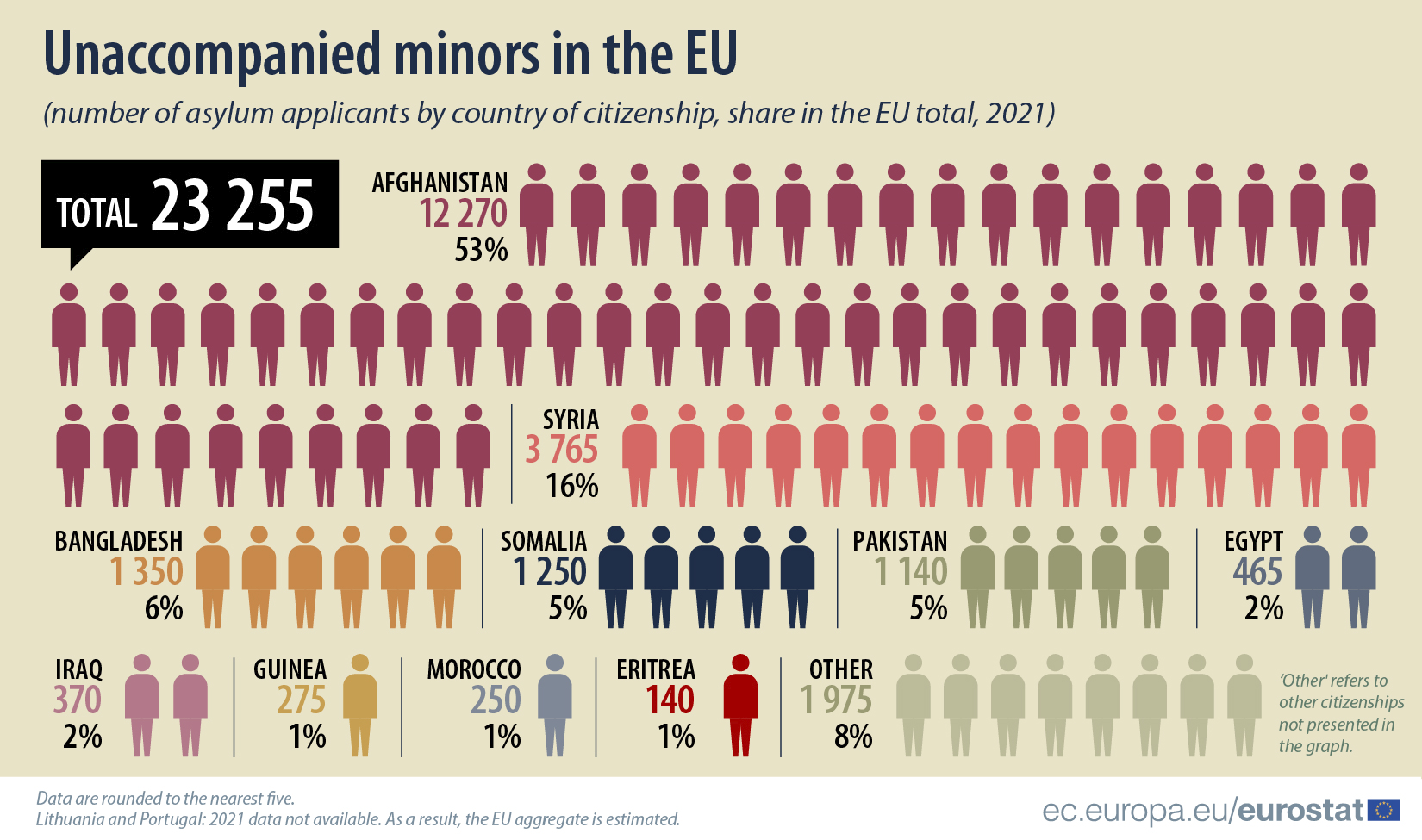 Sipas Eurostat, në vitin 2021, kishte 23 255 aplikantë për azil që u konsideruan të mitur të pashoqëruar, me 72% rritje krahasuar me vitin 2020 (13 550). Në një masë të madhe, kjo rritje u shkaktua nga rritja e numrit të të miturve të pashoqëruar nga Afganistani (12 270 në 2021 krahasuar me 5 495 në 2020).