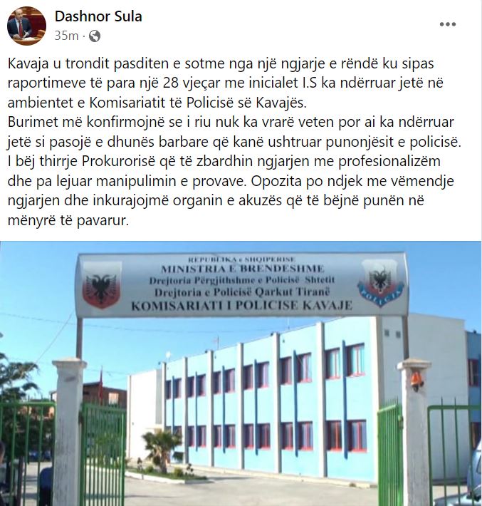 “Kavaja u trondit pasditen e sotme nga një ngjarje e rëndë ku sipas raportimeve të para një 31 vjeçar me inicialet I.S ka ndërruar jetë në ambientet e Komisariatit të Policisë së Kavajës. Burimet më konfirmojnë se i riu nuk ka vrarë veten por ai ka ndërruar jetë si pasojë e dhunës barbare që kanë ushtruar punonjësit e policisë. I bëj thirrje Prokurorisë që të zbardhin ngjarjen me profesionalizëm dhe pa lejuar manipulimin e provave. Opozita po ndjek me vëmendje ngjarjen dhe inkurajojmë organin e akuzës që të bëjnë punën në mënyrë të pavarur” – shkruan Sula.