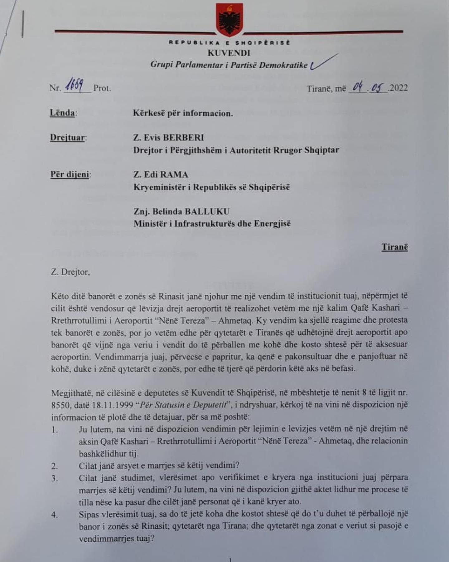 Deputetja e Partisë Demokratike, Andia Ulluri ka dorëzuar në Kuvend shkresën që i drejtohet drejtuesit të Autoritetit Rrugor Shqiptar, Evis Berberi për ndryshimin e sensit të lëvizjes në aksin Qafë Kashar-Rinas që ka çuar në protestë edhe banorët e zonës.