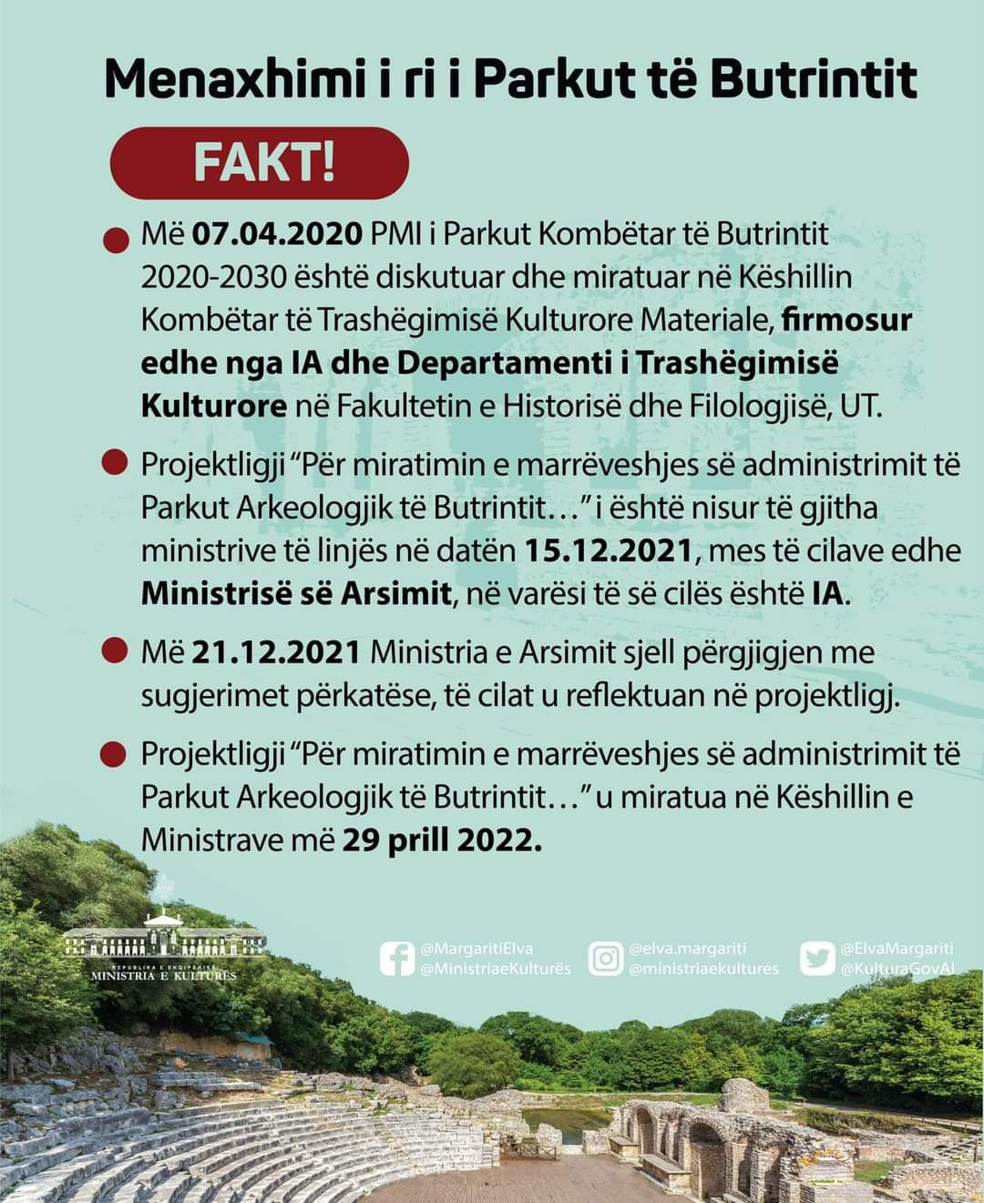Ndër të tjera ai ka renditur disa nga emrat e ekspertëve me të cilët sipas tij duhet të thirreshin nga Ministria për të komunikuar rreth kësaj çështje, përpara se të vendosnin për menaxhimin e Butrintit.
