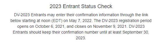 “Regjistruesit e DV-2023 mund të fusin numrin e tyre të konfirmimit duke filluar nga mesdita (EDT) 7 maj 2022. Aplikuesit e DV-2023 duhet të ruajnë numrin e tyre të konfirmimit të paktën deri më 30 shtator 2023.”- thuhet në faqen zyrtare.