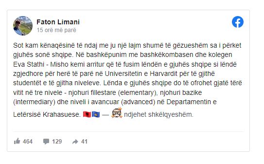“Sot kam kënaqësinë të ndaj me ju një lajm shumë të gëzueshëm sa i përket gjuhës sonë shqipe. Në bashkëpunim me bashkëkombasen dhe kolegen Eva Stathi – Misho kemi arritur që të fusim lëndën e gjuhës shqipe si lëndë zgjedhore për herë të parë në Universitetin e Harvardit për të gjithë studentët e të gjitha niveleve.