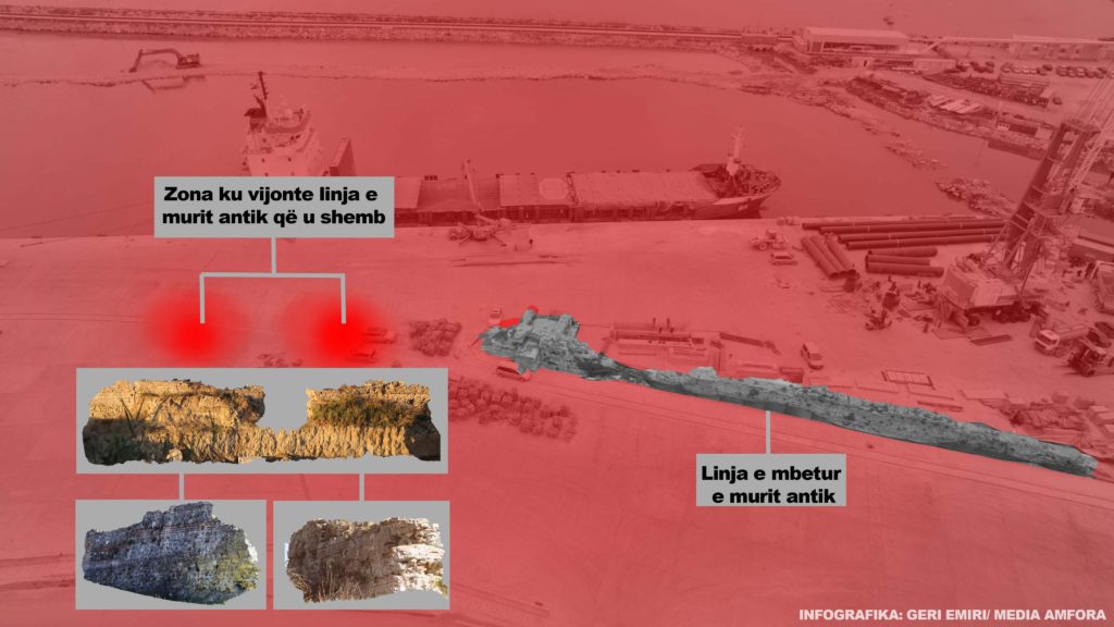 Të dhënat e siguruara nga Media Amfora përmes vëzhgimeve në terren dhe kërkesave për të drejtë informimi tregojnë se dëmtimi i murit antik nuk erdhi nga ndonjë sulm i anijeve armike, por nga punimet e kryera nga kompania koncesionare Porti MBM, që po ndërton një port hidrokarburesh dhe mallrash në PortoRomano.