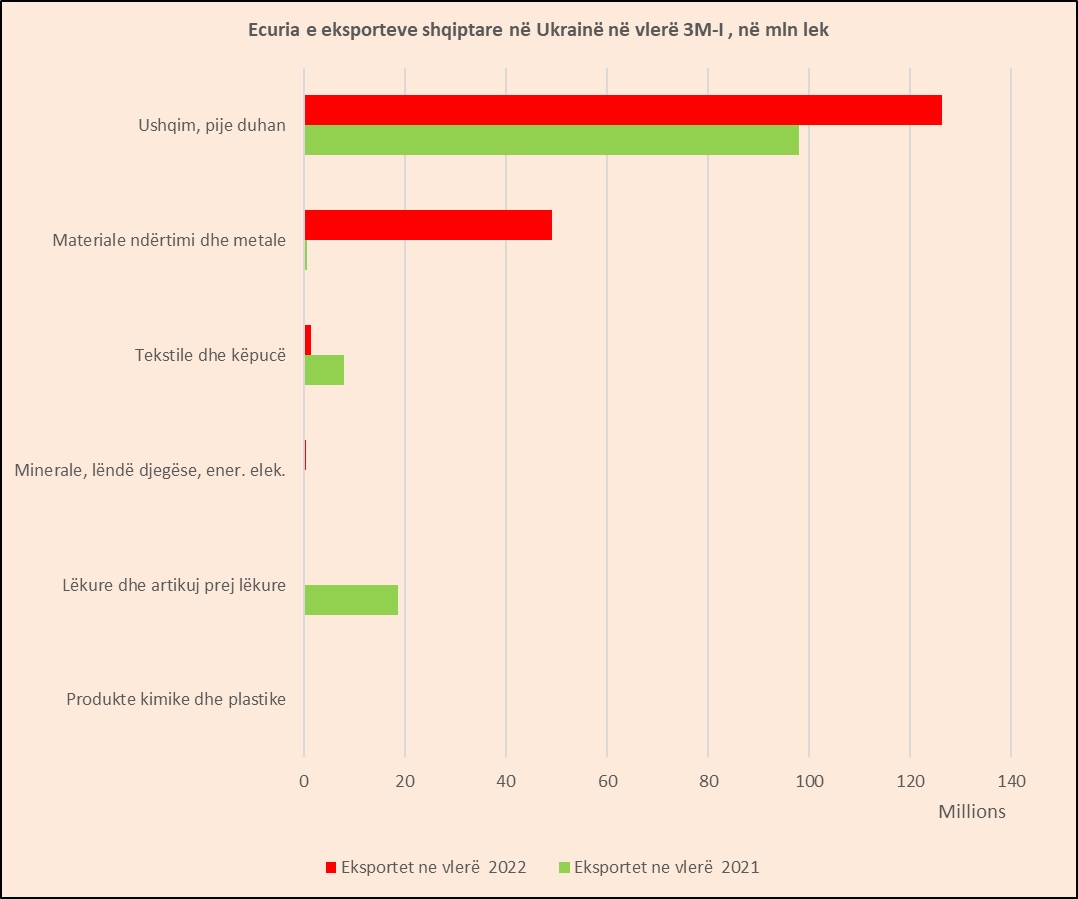 Rritje të lartë shënuan edhe eksportet shqiptare drejt Ukrainës, por me ritme më të ulëta se importet. Për të njëjtën periudhë të vitit 2022 vlera e mallrave të eksportuara në Ukrainë u rrit me 41% në vlerë dhe mbi 3% në sasi.