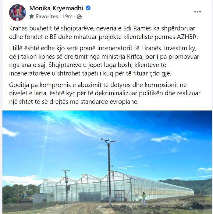 “Krahas buxhetit të shqiptarëve, qeveria e Edi Ramës ka shpërdoruar edhe fondet e BE duke miratuar projekte klienteliste përmes AZHBR. I tillë është edhe kjo serë pranë inceneratorit të Tiranës. Investim ky, që i takon kohës së drejtimit nga ministrja Krifca, por i pa promovuar nga ana e saj. Shqiptarëve u jepet luga bosh, klientëve të inceneratorëve u shtrohet tapeti i kuq për të fituar çdo gjë. Goditja pa kompromis e abuzimit të detyrës dhe korrupsionit në nivelet e larta, është kyç për të dekriminalizuar politikën dhe realizuar një shtet të së drejtës me standarde evropiane.” – shkruan Kryemadhi.