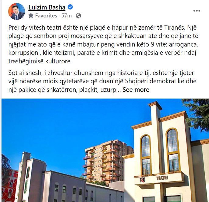 “Prej dy vitesh teatri është një plagë e hapur në zemër të Tiranës. Një plagë që sëmbon prej mosarsyeve që e shkaktuan atë dhe që janë të njëjtat me ato që e kanë mbajtur peng vendin këto 9 vite: arroganca, korrupsioni, klientelizmi, paratë e krimit dhe armiqësia e verbër ndaj trashëgimisë kulturore. Sot ai shesh, i zhveshur dhunshëm nga historia e tij, është një tjetër vijë ndarëse midis qytetarëve që duan një Shqipëri demokratike dhe një pakice që shkatërron, plaçkit, uzurpon një nga institucionet më të shenjta të kombit.” – shkruan Basha.