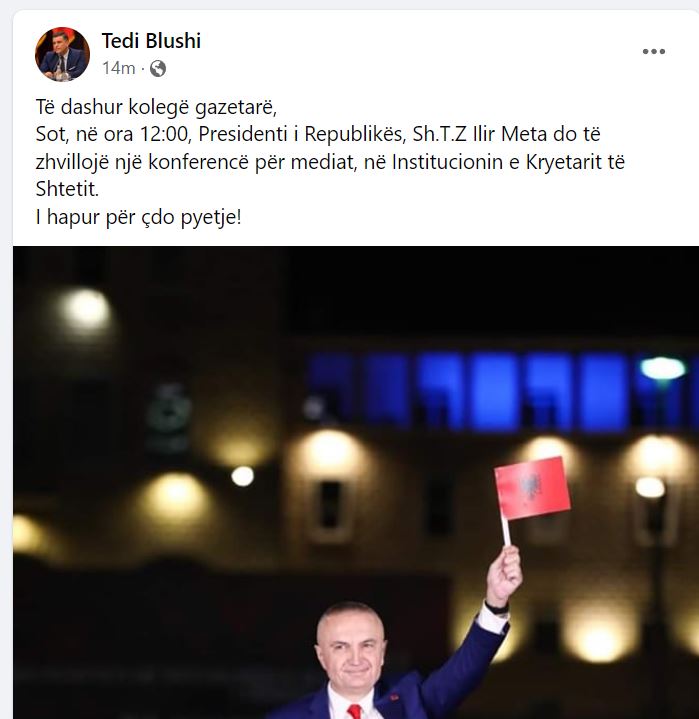 Njoftimi është bërë nga zëdhënësi i kreut të shtetit Tedi Blushi në Facebook. Konferenca për shtyp vjen një ditë pas një shkrimi në median austriake ‘Kronen Zeitung’ ku Meta akuzohet për lobim me anë një të kompanie qipriote në parajsat fiskale për një foto me ish-presidentin amerikan Donald Trump.
