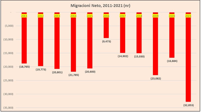 Në vitin 2021 u regjistrua dhe niveli më i lartë i të larguarve neto nga vendi në një dekadë, me gati 33 mijë persona që ikën pa kthim. Ritmet e ikjes u përshpejtuan ndjeshëm pas frenimin në periudhën e pandemisë, në 2020-n.
