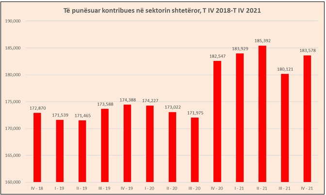 Sipas të dhënave të INSTAT nga burimet administrative (të punësuarit me sigurime) të punësuarit në shtet u rriten me 6.2% nga viti 2018 në fund të vitit 2021, ndërsa të punësuarit në privat u zgjeruan me vetëm 2.4%.