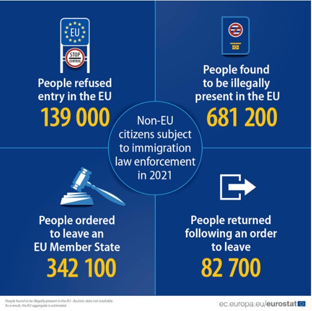Qytetarët e pranishëm në mënyrë të paligjshme ne BE u rriten me 2% krahasuar me vitin 2020. Në vitin 2021, rreth 681,200 qytetarë jashtë BE-së u gjetën të pranishëm në mënyrë të paligjshme në BE. Kjo ishte 22% në krahasim me vitin 2020 (557 500).