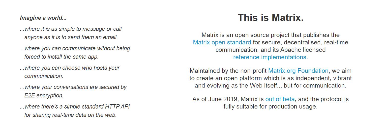 “Matrix është një projekt me burim të hapur që publikon standardin e hapur të Matrix për komunikim të sigurt e të decentralizuar në kohë reale zbatimet e referencës të serverit të saj Apache të saj të licencuar. E mirëmbajtur nga fondacioni jofitimprurës Matrix.org, ne synojmë të krijojmë një platformë të hapur e cila është po aq e pavarur, e gjallë dhe në zhvillim sa vetë Ëeb-i…por për komunikim. Që nga qershori 2019, Matrix ka dalë nga versioni beta dhe protokolli është plotësisht i përshtatshëm për përdorim.”