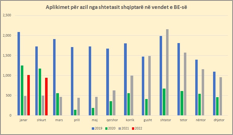 Sipas Eurostat, në shkurt 2022, 54 565 aplikantë për azil për herë të parë (qytetarë jo të BE-së) aplikuan për mbrojtje ndërkombëtare në Shtetet Anëtare të BE-së, 85% më shumë krahasuar me shkurtin 2021 (29 470) dhe 3% më shumë krahasuar me janarin 2022 (52 810).