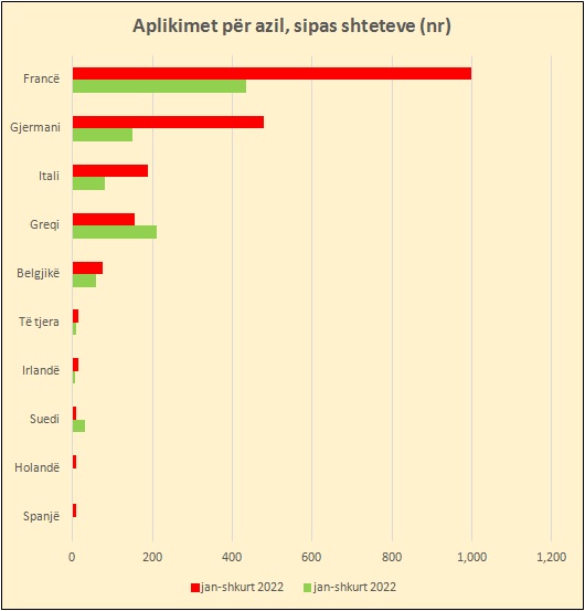 Shteti më i preferuar për të kërkuar azil mbetet Franca, me gati gjysmën e aplikimeve në total, për shkak të politikave më sociale që ai ndjek ndaj emigrantëve. Drejt këtij shteti aplikimet u rritën me 130% në janar-shkurt në raport me dy muajt e parë të 2021-t.