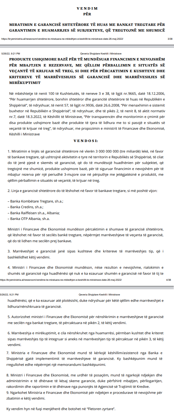 Qeveria shqiptare miratoi sot garancinë sovrane prej 3 miliard lekësh për të gjitha bizneset që tregtojnë mallrat e shportës, që do të duan të përfitojnë nga kjo kredi me garantues shtetin, me qëllim mbulimin e kapitalit qarkullues për lëndët dhe ushqimet bazë.