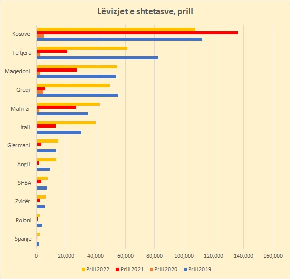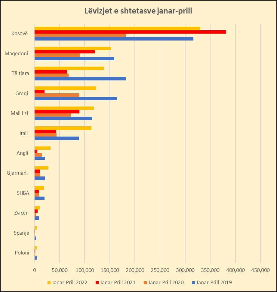 Gjatë katërmujorit të parë 2022, nga vendet që kanë hyrjet më të larta të shtetasve në Shqipëri, Greqia ka pasur rritjen më të madhe me 6 herë, ndërsa Kosova ka pasur rënien më të ndjeshme me 13,.%, krahasuar me të njëjtën periudhë të vitit 2021