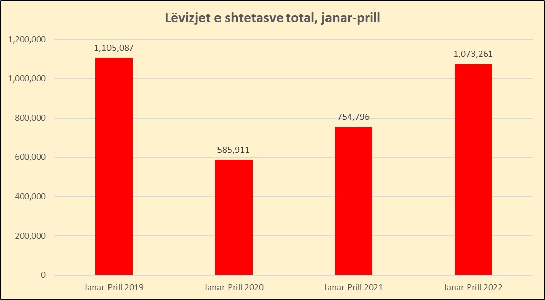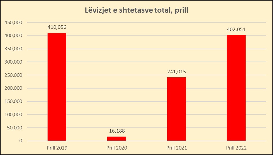 Sipas INSTAT, Hyrjet e shtetasve shqiptarë dhe të huaj në territorin shqiptar, në muajin Prill 2022, janë 832.920. Krahasuar me Prill 2021, ky tregues rezulton me një rritje 78.6%. Në Prill 2022, numri i shtetasve të huaj që kanë hyrë në territorin shqiptar është 402.051. Krahasuar me Prill 2021, ky numër është rritur me 66.8%.