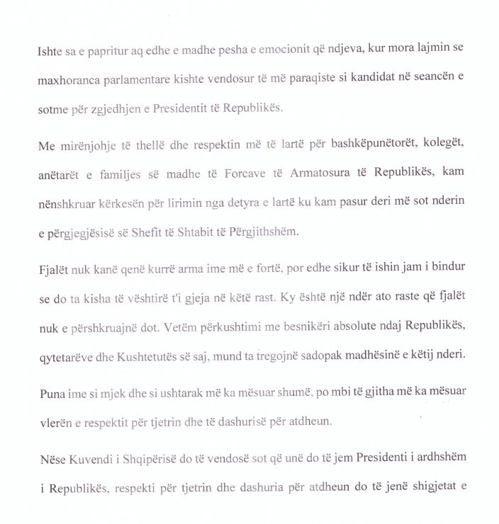 Nëse Kuvendi i Shqipërisë do të vendosë sot që unë të jem President i ardhshëm i Republikës, respekti për tjetrin dhe dashuria për Atdheun do të jenë shigjetat e busullës sime në atë detyrë të lartë. Respekt pa kushte për të gjithë shqiptarët pa dallim feje, krahine, dhe ideje. Respekt i barabartë për të gjitha palët përfaqësuese të popullit shqiptar. Respekt për miqtë dhe aleatët strategjikë të Shqipërisë, Shqipërinë mbi gjithçka. Duke i falënderuar të tërë për fjalët e mira e mesazhet miqësore, lutem përulësisht mirëkuptimin e të gjithëve për refuzimet e intervistave apo prononcimeve mediake.