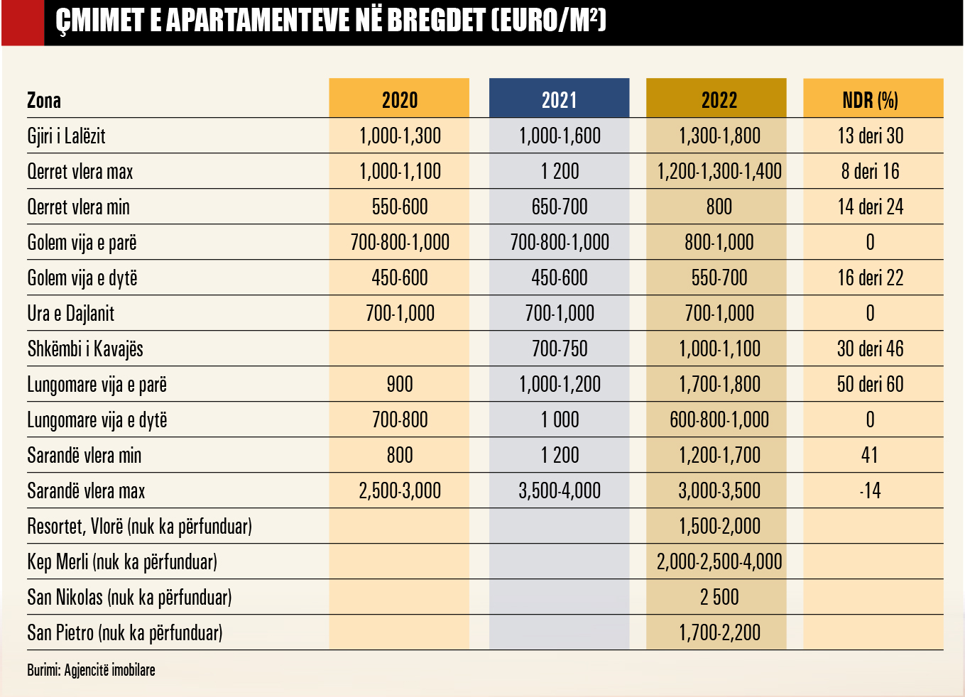 Kërkesa e lartë nga shtetas të huaj ka rritur 40-60% çmimet e apartamenteve ekzistuese nga Shkëmbi i Kavajës, Lungomare e deri në Sarandë brenda vitit. Në resortet e reja që po ndërtohen në Rivierë, çmimet e apartamenteve nisin nga 2,000 deri në 4,500 euro/m². Këtë vit janë shtrenjtuar edhe çmimet e vilave në bregdet. Vilat elitare me pamje nga deti po shiten 1,2 mln euro nga 1 mln euro që ishte çmimi i tyre në vitin 2021. Në resortet e Jugut, pronat po blihen më shumë nga shqiptarët, për të investuar në qiradhënie apo rishitjen e tyre te të huajt, për shkak të rritjes së çmimeve nga viti në vit.
