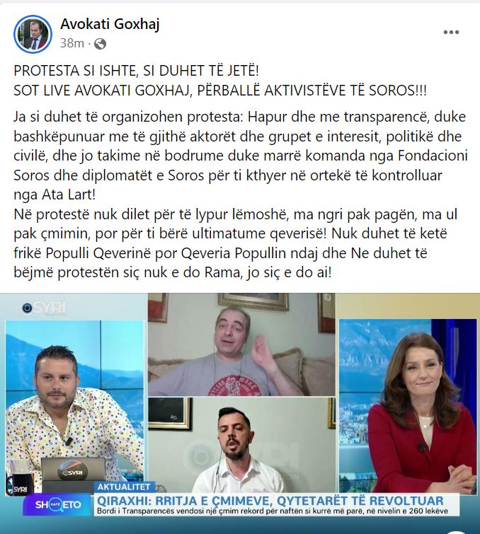 “Protesta si ishte, si duhet të jetë! Sot live avokati Goxhaj, përballë aktivistëve të soros!!! Ja si duhet të organizohen protesta: Hapur dhe me transparencë, duke bashkëpunuar me të gjithë aktorët dhe grupet e interesit, politikë dhe civilë, dhe jo takime në bodrume duke marrë komanda nga Fondacioni Soros dhe diplomatët e Soros për ti kthyer në ortekë të kontrolluar nga Ata Lart! Në protestë nuk dilet për të lypur lëmoshë, ma ngri pak pagën, ma ul pak çmimin, por për ti bërë ultimatume qeverisë! Nuk duhet të ketë frikë Populli Qeverinë por Qeveria Popullin ndaj dhe Ne duhet të bëjmë protestën siç nuk e do Rama, jo siç e do ai!” – shkruan Goxhaj në Facebook.
