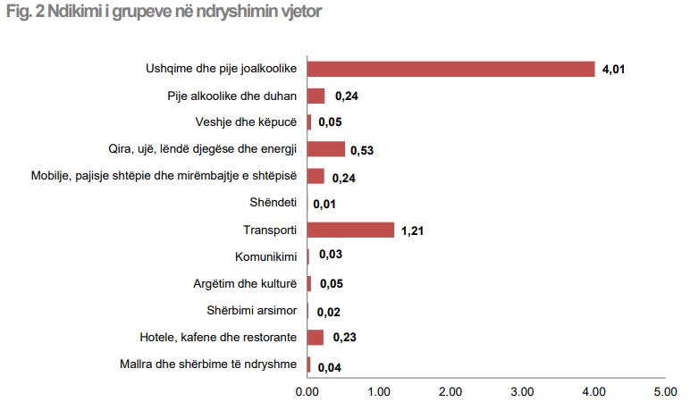 Çmimet e grupit “Shërbimi arsimor” me +0,02 pikë përqindje. Çmimet e grupit “Shëndeti” me +0,01 pikë përqindje.