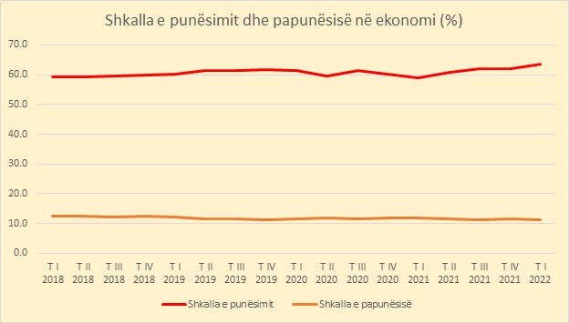 Vitin e kaluar, treguesit e papunësisë dhe punësimit shënuan një përmirësim gradual, duke reflektuar rimëkëmbjen e shpejtë të ekonomisë dhe të tregut të punës nga pasojat e pandemisë. Kjo tendencë duket se ka vijuar edhe gjatë tremujorit I 2022, pavarësisht rritjes së inflacionit, që po shkakton presione në rritje mbi kostot e biznesit.