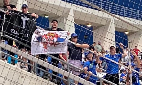 Njëri nga tifozët e Greqisë ka shfaqur një flamur në të cilin shihet harta e Kosovës e mbuluar me flamurin serb.