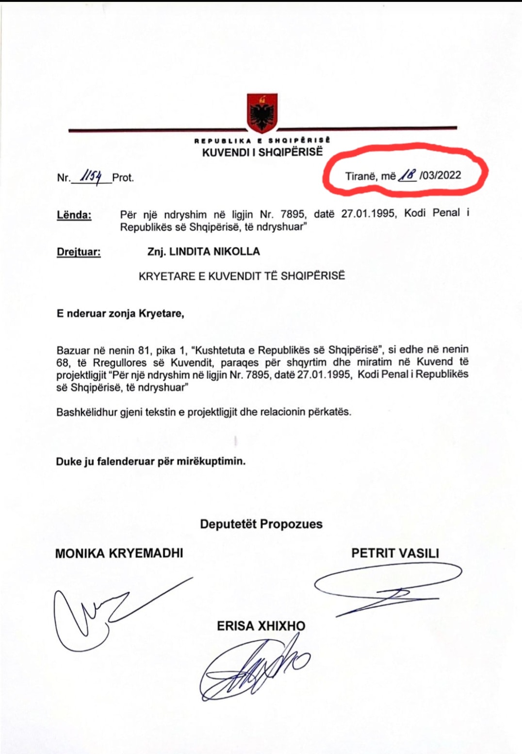 Apo projektligji për ndryshimin e Kodit Penal lidhur me tubimet firmosur nga deputetet Kryemadhi, Vasili dhe Xhixho depozituar që në 18 Mars 2022.