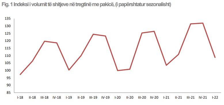 Në tregtinë me pakicë, pa përfshirë këtu tregtinë me pakicë të hidrokarbureve, volumi i shitjeve në tremujorin e parë 2022 është rritur me 5.5%, kundrejt tremujorit të parë të vitit 2021.
