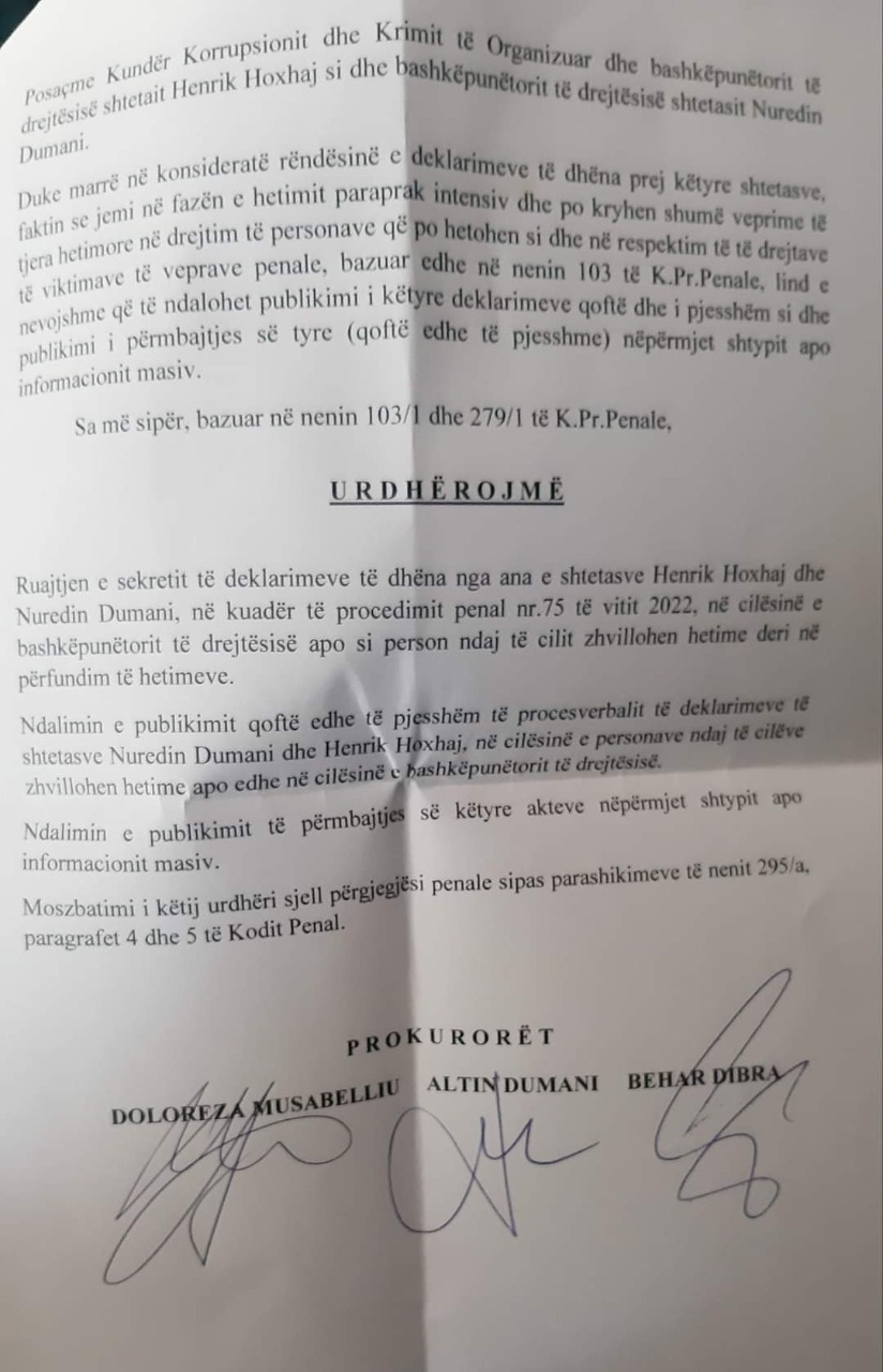 Ndalimin e publikimit qoftë edhe të pjesshëm të procesverbalit të deklarimeve të shtetasve Nuredin Dumani dhe Henrik Hoxhaj në cilësinë e personave ndaj të cilëve zhvillohen hetime apo edhe në cilësinë e bashkëpunëtorit të drejtësisë.