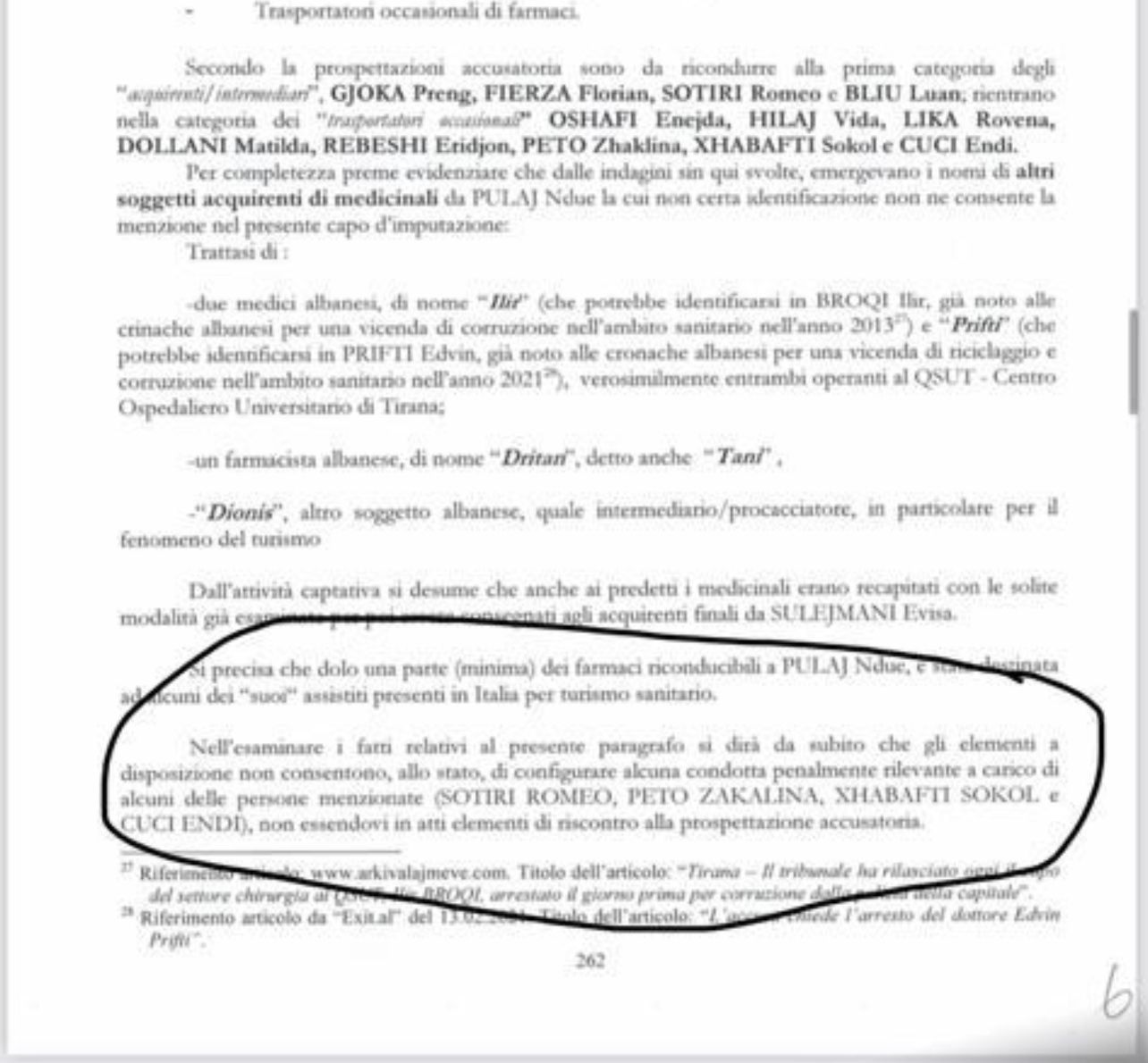 Në konkluzionet e hetimit prokurorët italianë shkruajnë : “në shqyrtimin e fakteve që lidhet me paragrafin në fjalë, bëjmë me dije që në fillim se elementet që kemi në dispozicion na ndalojnë, aktualisht, që të përcaktojmë ndonjë veprim me rendësi penale, në ngarkim të disa prej personave të përmendur (SOTIRI ROMEO, PETO ZAKALINA, XHABAFTI SOKOL dhe CUCI ENDI), duke qenë se nga aktet e hetimit nuk figuron asnjë element që t’i lërë vend ngritjes së akuzave në të ardhmen”.